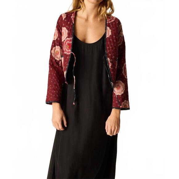 Meet the Saskia Jacket by Natalie Martin, a chic addition to any wardrobe with its floral, boho chic design in the Poppy Combo colorway. This women's jacket features long sleeves and a versatile reversible style, crafted from 100% cotton for a comfortable and breathable fit. Its V-neck design is complemented by a self-tie closure at the front, adding a charming touch. Care for this jacket with a gentle hand wash in cold water and line dry, or opt for professional dry cleaning. Available in sizes XS to L, catering to a range from size 0 to 12.