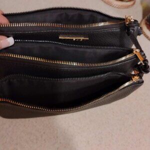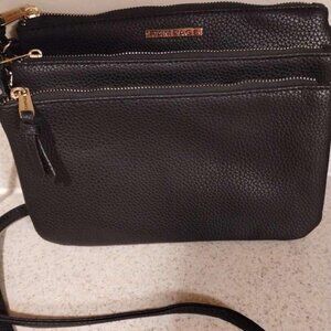 Never used Rampage black leather bag with adjustable body strap, 3 brass zippered compartments and hardware, also in the middle of each zipper compartment there is 2 more compartments. Lots of room for hand free travel.