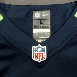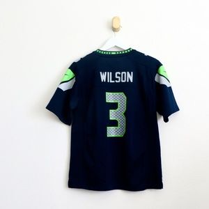 Description: This is a genuine NFL Nike on Field Seattle Seahawks Russel Wilson #3 Jersey. No rips, tears, marks, holes, stains, flaws or defects. NO damages. The jersey features short sleeves, NFL shield at collar, tailored designed for movement, mesh sides for extra breathability, soft satin polyester fabric, machine washable. Retail $80