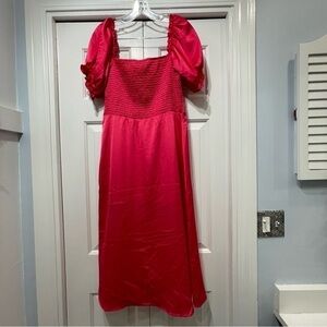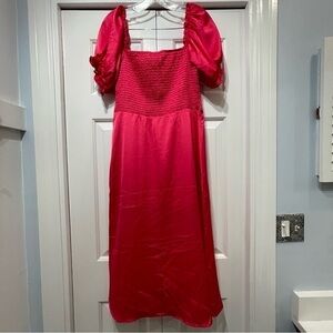 NSR Dress Women’s M Hot Pink Satiny Midi Ruched Bodice Side Zip Square Neck NEW