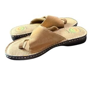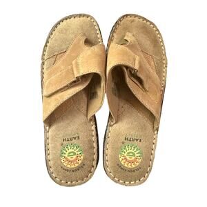 Earth Spirit slide sandals in a tan suede and leather blend. These toe-loop sandals offer cushioned comfort, flexible rubber soles, and detailed contrast stitching. New without tags – never worn. Style number 2582689.
