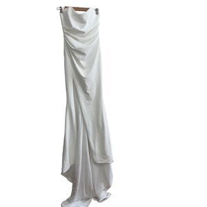 NEW NWOT Katie May X NOEL AND JEAN Divinity Gown Ivory is an absolute statement! This off white strapless gown features ruching at the body and a side slit. Open back twist details. Very dramatic long train. Fabric is a knit with some stretch. Side zip closure. 97% polyester, 3% spandex. Lining 100% polyester. Made in the USA!