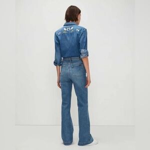 Our coveted Dojo trouser jeans, cut with an ultra high rise. Crafted from our signature Beauty denim made with collagen peptides for a cool-to-the-touch luxurious feel and live-in comfort stretch. A true blue hue is marked by whiskering, fading, and destroyed details, lending a lived-in aesthetic. Pair back to a fitted tee and denim trucker for easy, casual style.