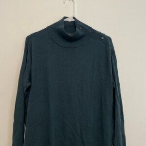 ◇ size large. Solid teal green ish blue ish overlay / solid light blue pastel blue underlay - twofer sweater (sweater with attached tank under). Mixed media mixed material - knit overlay / chiffon underlay. Asym asymmetrical button detail on one shoulder. Curved hem/hem is higher on sides, and features side vents/slits on both layers. Semi sheer on blue chiffon layer. Mock neck (according to brand) and long sleeve pullover sweater.