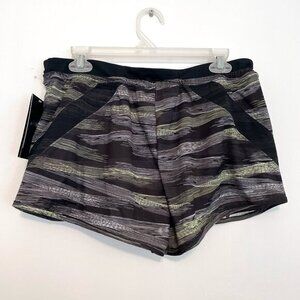 ◇ size large. Black / lime green / gray / white / multi multicolor geo geometric space dye ish and/or striped print ish. Contrast trim. Pull on / adjustable drawstring tie waist. Lined with built-in panty. "Stealth reflective technology in print" and "reflective trims" (according to brand). 2.5" in inseam. Active shorts active short activewear shorts activewear short