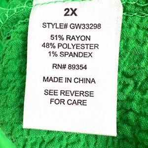 This plus-size 2X top features a vibrant green color and a unique wearable art design, making it a standout piece.