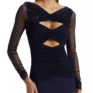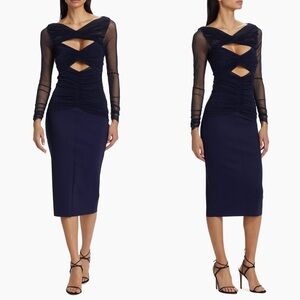NEW NWT Chiara Boni La Petite Robe Leitha Mesh Cutout Midi Dress Navy Blue Notte is such a stunning piece! This long sleeve midi length dress features sheer mesh sleeves and ruched mesh at neckline, bust and waist. Molded cups. Fabric is very stretchy. Side zip closure. 72% polyamide, 28% Elastane. Made in Italy!