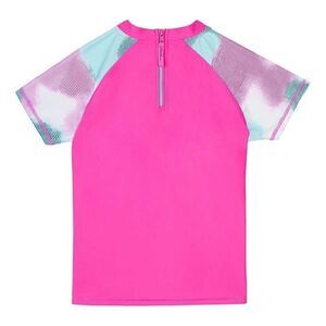 * Color block pink rash guard top with blue and pink watercolor print sleeves