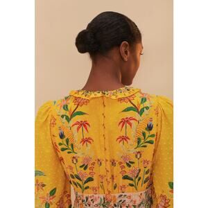 This enchanting piece features a lively mix of floral patterns in vivid yellows, greens, and pinks.