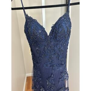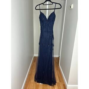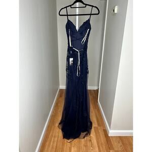 NEW NWT Faviana Glamour Applique Tulle Fitted V-Neck Gown Navy size 0