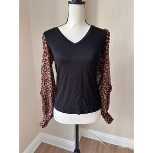 V Neck Long sleeve black blouse with speckled leopard print sheer sleeves. Lightweight comfortable material for any occasion