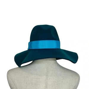 Gorgeous handmade 100% rabbit hair fedora with grosgrain ribbon trim and pinked edges. Large brim with the perfect combination of structure and floppiness. Color is a vibrant jewel toned peacock blue.