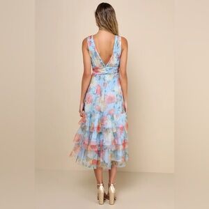 NEW NWT Lulu’s Perfectly Divine Blue Floral Tulle Tiered Ruffled Midi Dress