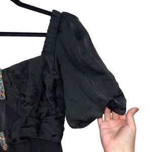 NEW NWT SANDRO Falbala Crystal Embellished Midi Dress In Black is such a statement piece! This short sleeve little black dress features a puff sleeve and a ruched bust with a cutout. Rainbow crystal embellishment at bust. Ruffled hem. Textured fabric. Back zip closure. Main fabric is 82% acetate, 18% polyamide. Lining is 100% polyester.