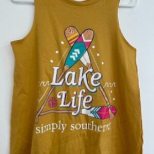 - solid mustard yellow with white "Lake Life" and "Simply Southern" spellout oar (?) multi multicolor graphic sleeveless crew neck tank top