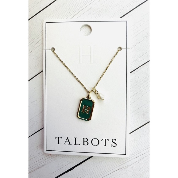 Elegant gold Talbots necklace with a gold initial H pendant and pearl charm. Perfect for adding a personal touch.