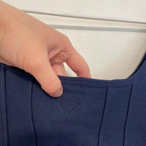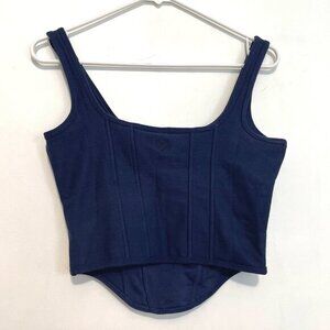 ◇ Size large (size chart in photos). Solid navy blue. Textured. Structured with princess seam details. Curved hem / hem is higher on sides. Embroidered "P" and leaf leaves logo on back of neckline. Wireless. Scoop neck and sleeveless corset / bustier style cropped crop top tank top shirt.