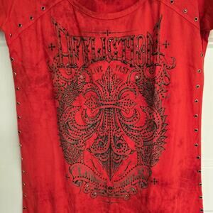 NEW WITH TAGS - women's Affliction red and black, scoop neck tee with rhinestones. This has minimal stretch.