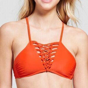 NEW NWT XHILARATION Macrame Strappy High Neck Bikini Top Mustard Gold Floral XS