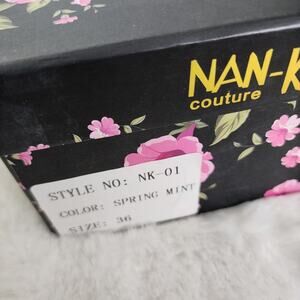 In the original box, these Nan-Ku Couture x Free People "Cruise" high-top sneakers are the perfect statement shoe. The "Spring Mint" colorway is a beautiful green canvas with studded rhinestone and metallic detailing on the outsoles.