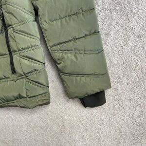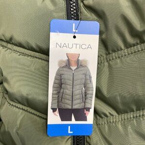 NEW Nautica Women's Size L Olive Green Quilted Puffer Jacket W/ Faux Fur Hood