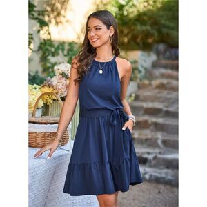 NEW Navy Blue Halter Mini Dress Ruffle Pockets M