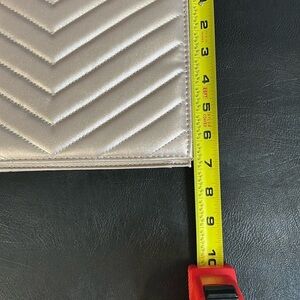 NEW Neiman Marcus Rose Gold Metallic Chevron Quilted Clutch with Tassel Detail