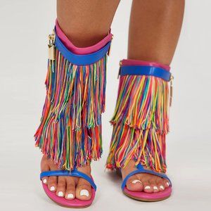 NEW🔥 Neon Fringe Cuff Padlock Ankle Booties Flat Boho Sandal Open Toe w/ Zipper