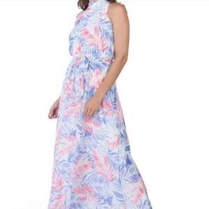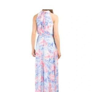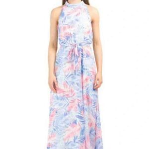Blue/Coral multi floral print; Lined; Keyhole back with tie closure; Self tie sash belt; Sleeveless; Halter neck with tie detail; Maxi dress; Back zip closure; Polyester; Hand wash; Imported; Retail price $298