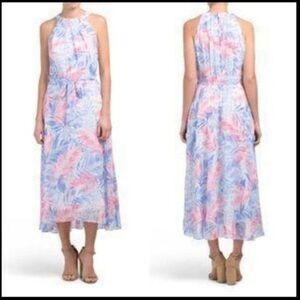 NEW! Nicole Miller New York Tropical Coral & Blue Palm Print Halter Tie Neck Maxi Dress ~ Size 8 ~ $298