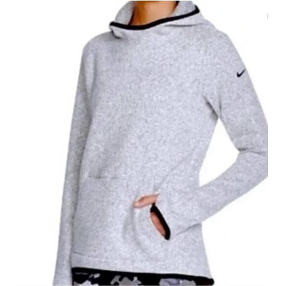 Description: This is a genuine Women's Nike Dri-Fit Hypernatural Therma Hooded Sweat Shirt. No rips, tears, marks, stains, flaws or defects. NO damages. The sweatshirt features attached hood, long sleeves with thumbholes, hidden side zip pocket, signature Nike swoosh logo embroidered on left sleeve, front kangaroo pocket, black trim detail, soft fleece lined, soft polyester fabric, machine washable, imported. Retail $80