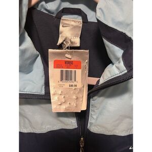 This is a NWT vintage Nike windbreaker jacket for women in size Large. It is made of blue polyester with a nylon insulation material. The jacket features a full zip closure, lined with polyester for added warmth. It is designed for travel and casual wear, with zip accents and a Y2K style. Ideal for rainy or windy weather, this jacket offers both style and functionality.
