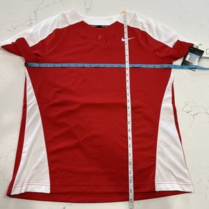 Brand new with tags. No flaws. This Nike Softball Jersey Shirt is perfect for your next practice or game. The classic/fitted short sleeves and V-neckline provide a comfortable fit, while the moisture-wicking and breathable features keep you cool and dry during summer, fall, and spring seasons. The red and white solid pattern with the Nike logo adds a touch of style to your athletic wear. The one-button closure and polyester fabric wash make it easy to care for. Available in Medium size and regular fit, this jersey is a great addition to your activewear collection.