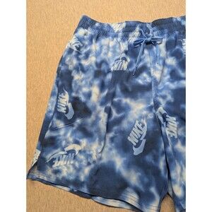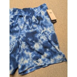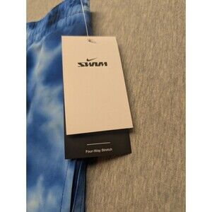 The product is a pair of Nike swim trunks in a blue and white tie-dye pattern, featuring the Nike text and Swoosh emblem. These trunks are made of 90% polyester and 10% elastane, with a polyester lining for added comfort. They are machine washable and designed with an elastic waist, drawstring closure, and built-in brief for a secure fit. Perfect for beach, water sports, pool, and swim activities, these trunks are a stylish and functional choice for men looking for high-quality swimwear.