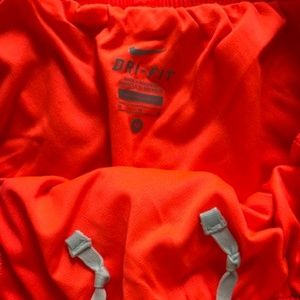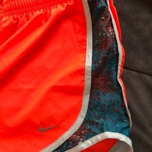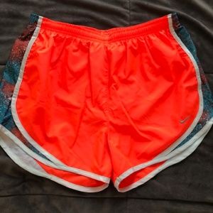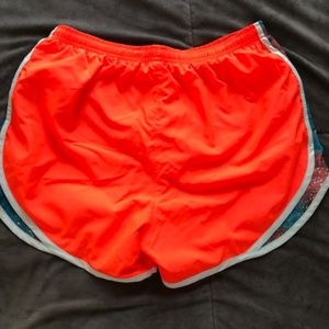 Fun neon orange Nike Tempo Shorts with black and teal design on the sides. Built in underwear lining and elastic drawstring to tighten.