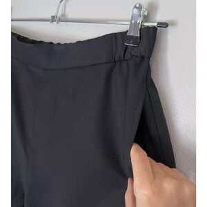 A black wool pant with an elasticized waistband, side pockets, back welt pockets.Cropped length. Flat Front. Mid rise, relaxed fit. Side Slit at ankle. Made in USA. New with partial tags.