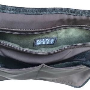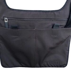 Small brown messenger bag with velcro adjustable strap, and buckle. Sits flat on hip.