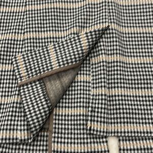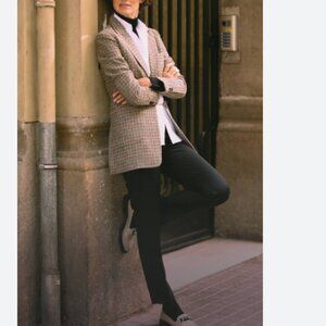 This long line blazer in a black and tan plaid from Nine West in a stretchy lightweight material has a roomy, menswear-inspired shape and modern look.