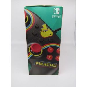 This controller is primarily black and features Pikachu front and center, as well as "Pikachu" on the right side and "25", Pikachu's National Dex number, on the left. The game pad, buttons, and joysticks are red, and it has rainbow accents.