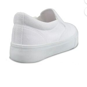New. White canvas slip-ons . Two elastic gores on the top for comfort. Padded at heel. Wide white sidewall. Never worn. NEW