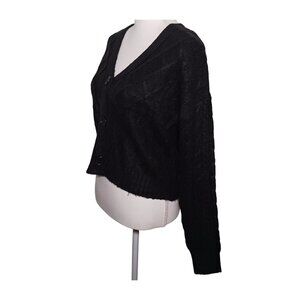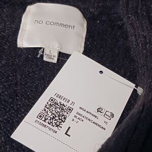 Keywords: cable knit cardigan, V-neck cardigan, button front sweater, No Comment sweater, black knitwear, women's cardigan, size L sweater, black cable knit, stylish sweater, soft knit cardigan, large black sweater, black cardigan sweater, acrylic knit cardigan, Classic cardigan, Traditional sweater, Forever 21 cardigan