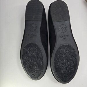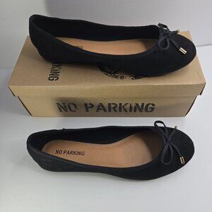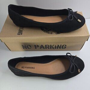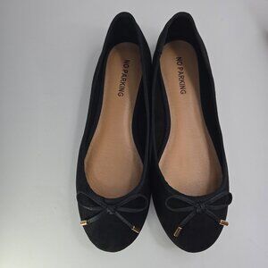 Tried on, but never worn. No Parking brand black flats with velvet style fabric. They have small bows on the tops in black with gold aglets. Size US women's 8.5. See photos for additional details.