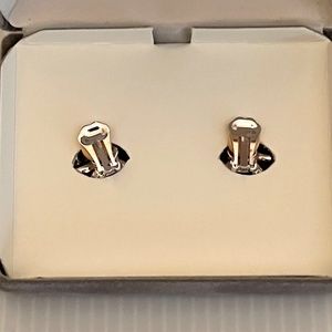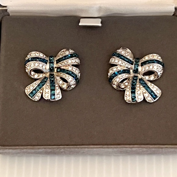 New without tags in perfect condition - a pair of vintage clip-on Nolan Miller earrings in the shape of bows, stylized with blue and white rhinestones. Approx. 1"x1". Comes with the box and certificate of authenticity.