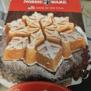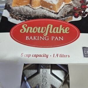Nordic Ware Snowflake Baking Pan from the Seasonal Collection. Model 88248. Made of Heavy Cast Aluminum. 6 Cup Capacity. Measures about 11" across point-to-point. Nonstick and made in the USA. Brand new and smoke-free home.