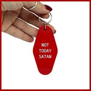 Tell Satan who's boss with this funny keychain that says "Not Today Satan" in white lettering on red acrylic.