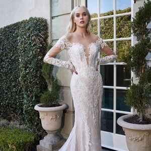 The elegant wedding dress made in the silhouette of the sheath will emphasize your curves and a long floor-length skirt will create an elegant gait, while a delicate lace adorning the entire perimeter of the dress will create a delicate image of the bride.