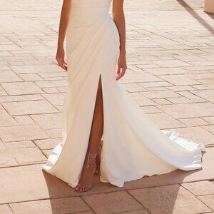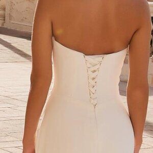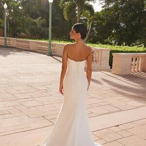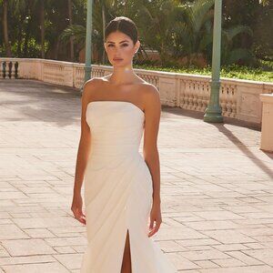This off-white strapless sheath dress features a sleek straight-across neckline and a flowing train for a sophisticated, modern look. Perfect for weddings or formal events, its figure-flattering silhouette exudes elegance and timeless charm.