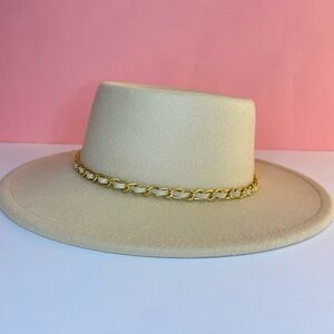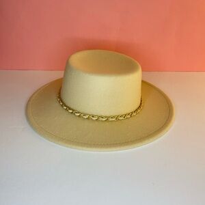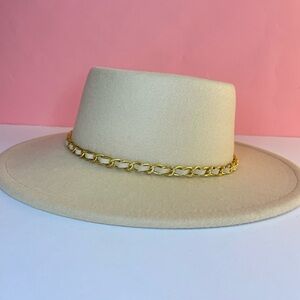 NEW ON TREND FASHION IVORY BRIM HAT GOLD CHAIN ACCENT