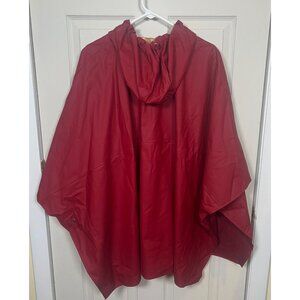 This rain poncho combines functionality with stylish design, featuring a durable fabric and Southwestern-inspired lining. Its hood and drawstring closure offer protection and comfort during wet weather, while the vibrant red color enhances visibility and style.