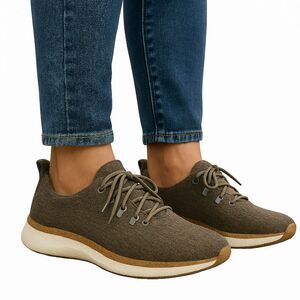 A cozy sneaker inspired by travelers, for all who move. Comfy. Easy. Light. Travel Lite®. Courier in olive green is completely unlined and hand crafted with a soft, wool mix fabric. Cork insoles. Soft, glove-like fit.